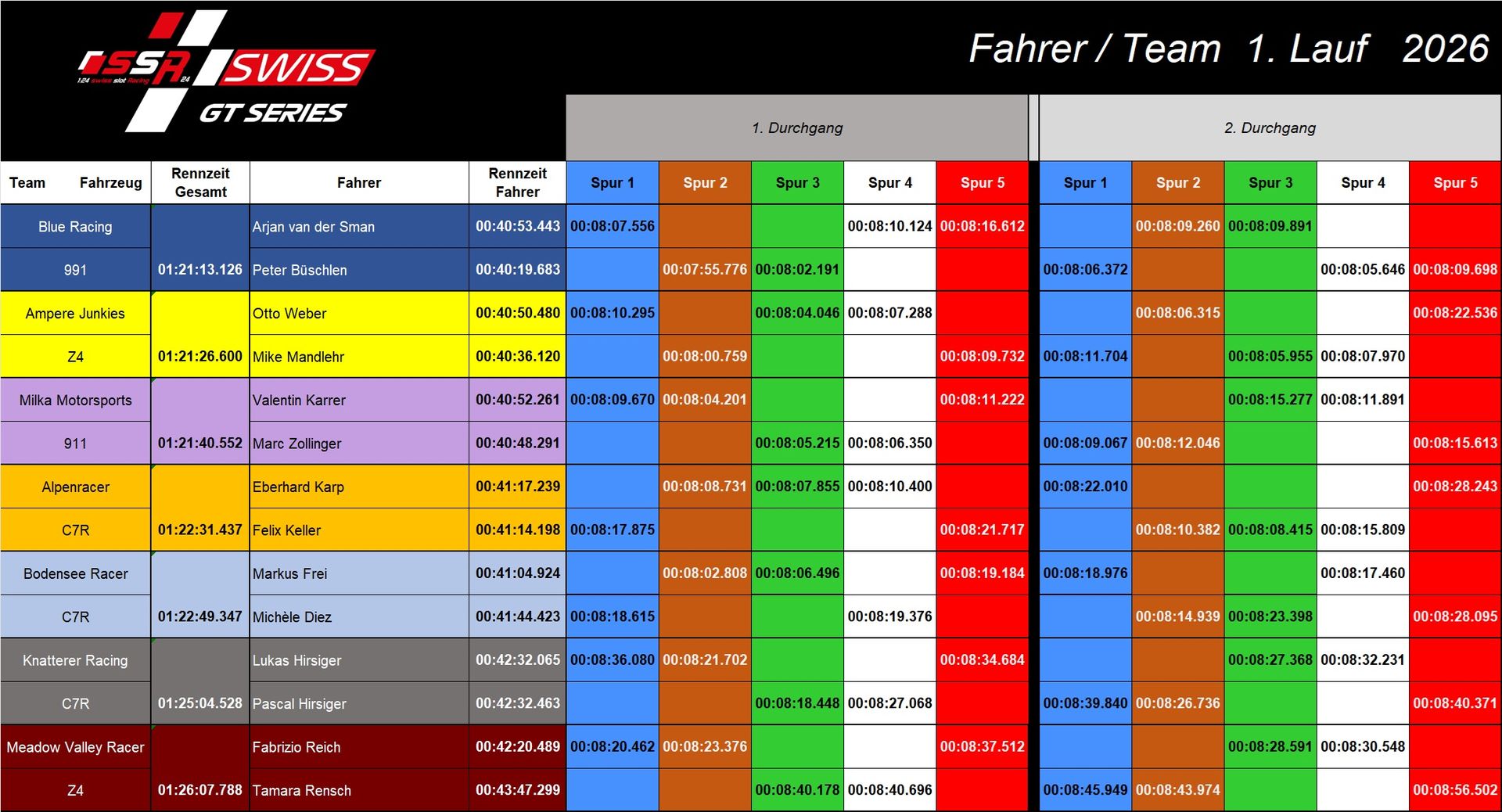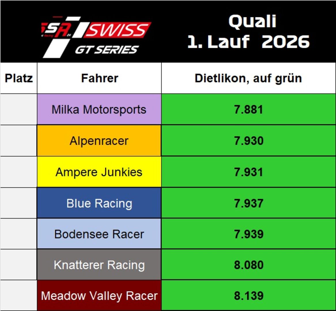 1.Lauf SSR24 SWISS GT 2026 Bei den Fahrer hatte es einen Fehler. Ich hatte bei Markus und Michèle Spuren vertauscht.Bei Michèle hat sich nichts geändert, Markus ist so 2 Plätze weiter vorne. Sorry.